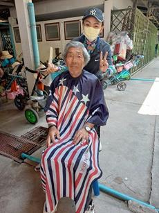 食事後キャディー控え所の前で散髪 やはり短いほうがさっぱりして良いなー・・・