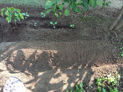 マンゴーの木の下へ2か所造成 芽が出たのを見て植替え