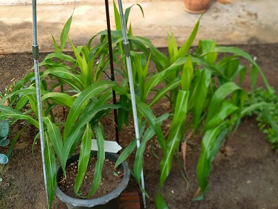 隣のとうもろこし 順調! 朝顔カーテン 黒は遮光用 咲けば撤去