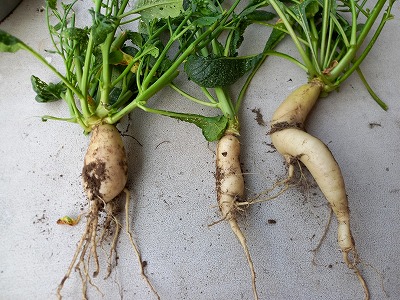 花が咲いたので調べるも正確には不明 本日の収穫 貧弱だが大根