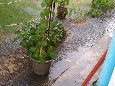 昔あったような夕方に大雨 朝顔のグリーンカーテンの窓から雨水が侵入、庭を見ると洪水