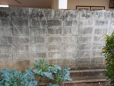 ブロッコリーの奥に 6本 朝顔を紐でよじ伸ばせる