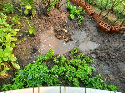 ベランダ前の畑 ヤシの木の根っこ取りたいのだが・・・ 周りから崩して水撒き 持久戦だー