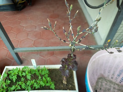 レタスの成れの果て 硬いが少しは食べる 右赤レタス 左はトマト(今週中に植替え)