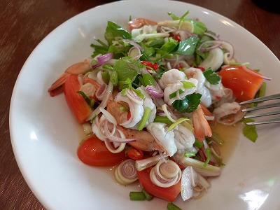 4人で昼食 ヤムクンソット ゆでたエビのサラダ 涼しさもあって話が進んで12時半帰宅