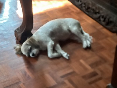朝食 マンゴを挟んでチーズパン ルンは椅子に座り見てるだけだが。7時の散歩は元気