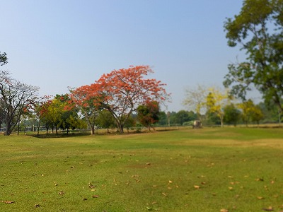 黄色と赤が目立つゴルフ場 紫は少し 14番終えた茶店 テーブル設置は良いが開いていない