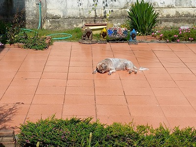 ここは暑いから次回へ 終えてびっくり、日光浴のルンちゃん