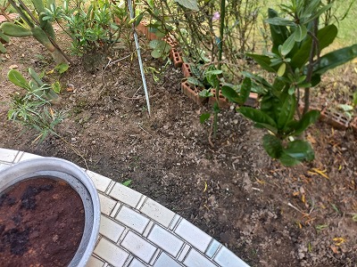 雑草取り 左はコーヒーカス 半分でグロッキー・・・