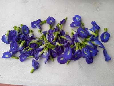 毎日100枚は取れる อัญชัน コップ2つに15枚 右はヘタ・茎
