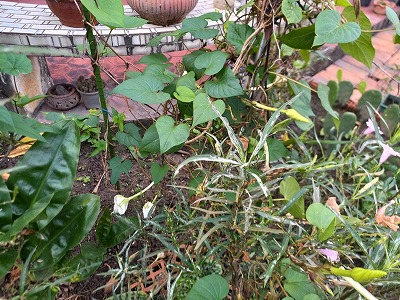 10本あるが初めに鉢のキュウリの花が咲く! 夕方けなげに毎日咲く朝顔