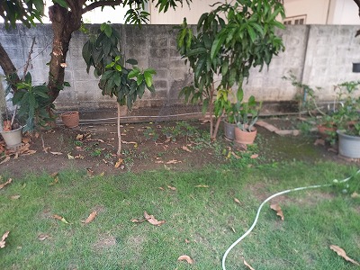 7時半散歩見送り、今日は2本の御マンゴーの間 雑草取り ついつい熱が入り1時間半
