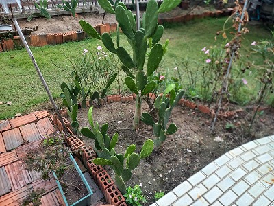 大型宝剣(ウチワサボテン)一個は花が咲いている 沢山あるが咲くのが珍しい!