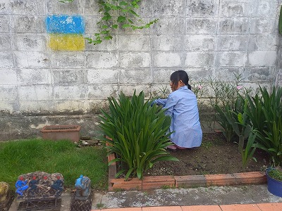 7時には約束のMちゃん来てくれ、側溝とその周辺の雑草取りをお願いする