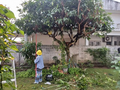 7時助っ人のMちゃんが来てくれ、もう一本のマンゴーの木の枝切断作業
