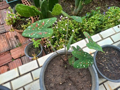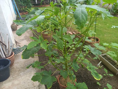 カラジューム 鉢からも出て来た? オクラ 虫食い発見? 葉っぱ切断・・・
