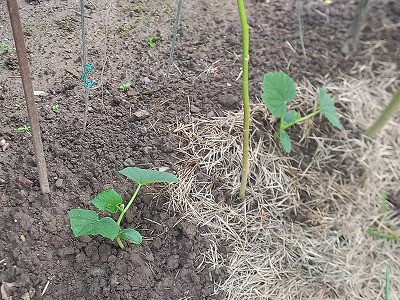 キュウリ 4本オクラ近くへ4本 前回のゴーヤとねぎの間のキュウリ まだ大丈夫!