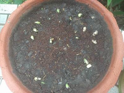 枝豆の苗が出て来た 収穫はやせ細って中身が少しで硬い 次へつなげるかー
