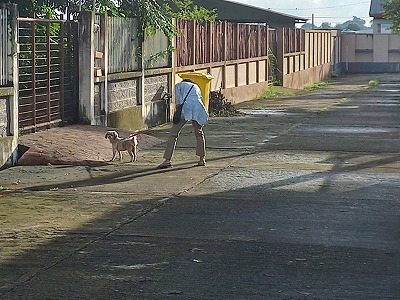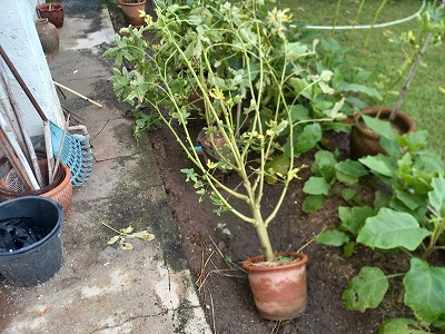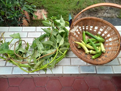 7時半ルンの散歩見送り 庭の点検と収穫(オクラと空芯菜)