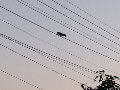 7時過ぎリスの綱渡り タイミングよく撮影 それを見ているルンだが吠える元気もないのだろうか?