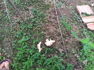 ショウガ 分けて植える 10本以上育てばOK・・・ 里芋 ちかじか掘って確認!