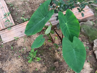 生姜畑に4本ほど芽が出ているが、新たに4・5本植える カラジュームかと思っていたが、(里芋)?