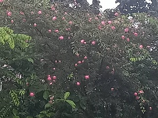 7時強い雨ではないが降り続けている 前の家のねむの木 散歩行きたいだろうが・・・