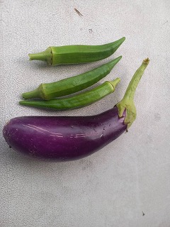 順番に咲くのは良い事だ! 食べきれないしなー・・ 帰ってもおやつ2つ 収穫(ナスは地面についてたのでダメ・・・)