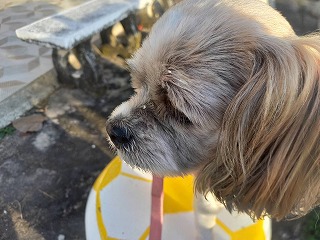久々にルンと2人での散歩だー! 広場では(朝市)それを見ながらルンちゃんへのおやつ
